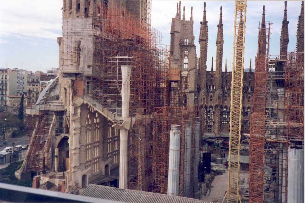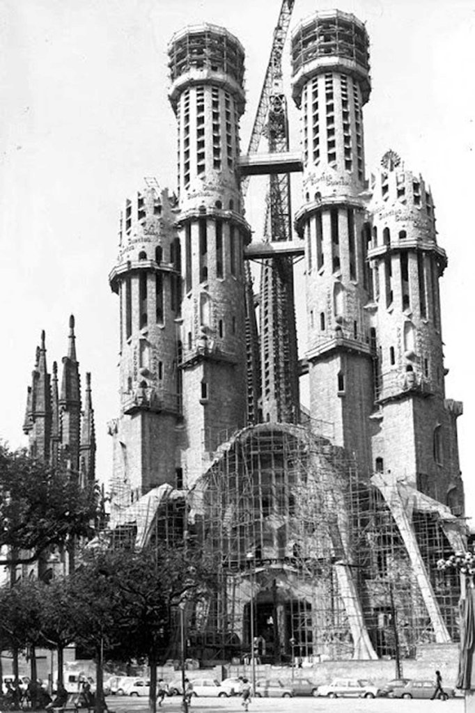 The Passion façade, constructed according to Gaudí’s 1917 design, commenced in 1954, with the stately spires adorning the elliptical plan completed in 1976. Notably, this façade captivates with its austere, anguished figures, including emaciated depictions of Christ enduring the scourging at the pillar and the crucifixion. These striking and, at times, controversial designs emerged under the artistic guidance of Josep Maria Subirachs.